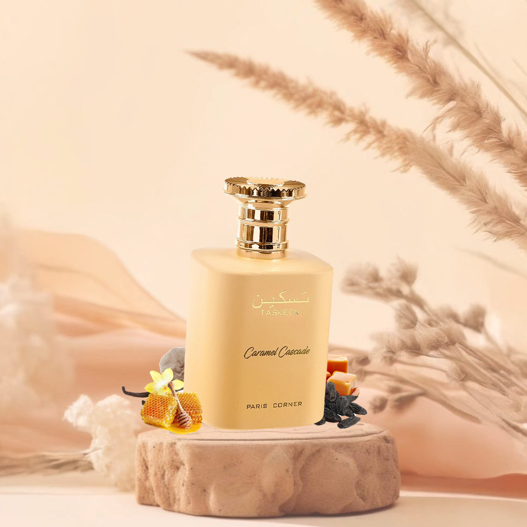 Faites plaisir à vos sens dans une symphonie de douceur avec Paris Corner Taskeen Caramel Cascade Eau de Parfum. Un parfum qui a ravi les amateurs de parfum avec son délicieux mélange de notes gourmandes. Ce parfum captivant, souvent comparé à un câlin chaleureux dans une bouteille, offre une expérience luxueuse à la fois réconfortante et ludique.